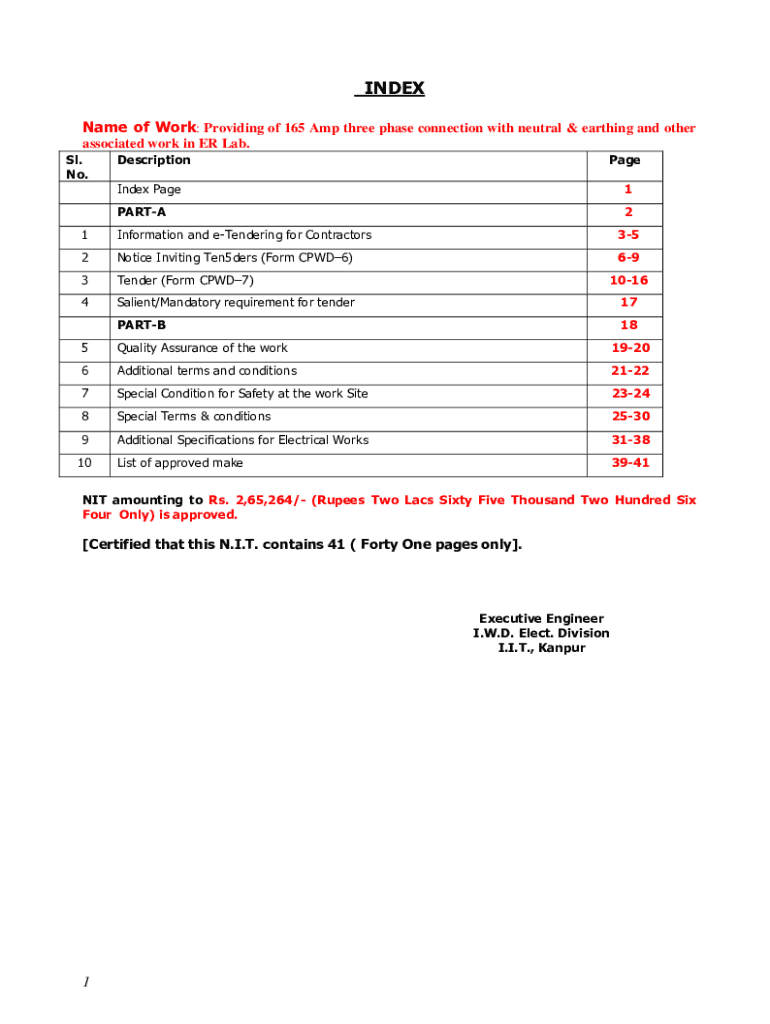 INDEX Name of Work: Providing of 165 Amp three-phase connection with neutral & earthing and other associated work in ER Lab. SL. No. DescriptionPageIndex Page1PARTA21Information and tendering for