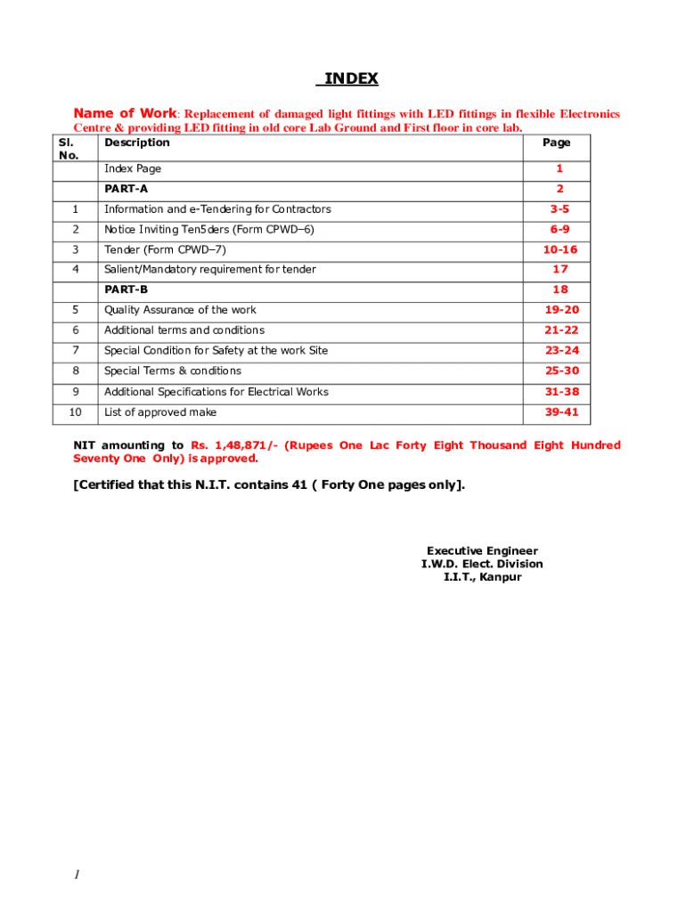 INDEX Name of Work: Replacement of damaged light fittings with LED fittings in flexible Electronics Center & providing LED fitting in old core Lab Ground and First floor in core lab. SL. No. DescriptionPageIndex