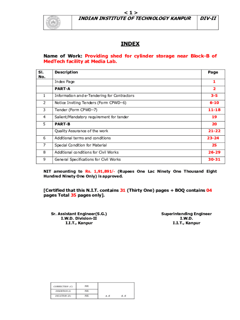 1INDIAN INSTITUTE OF TECHNOLOGY KANPURDIVIIINDEX Name of Work: Providing shed for cylinder storage near Block of Edtech facility at Media Lab. SL. No. DescriptionPageIndex Page1PARTA21Information