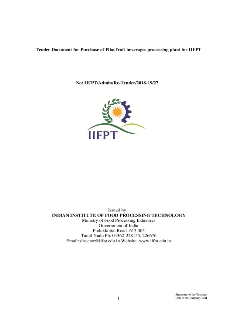 Tender Document for Purchase of Pilot fruit beverages processing plant for Inferno: II FPT/Admin/Pretender/201819/27Issued by INDIAN INSTITUTE OF FOOD PROCESSING TECHNOLOGY Ministry of Food Processing