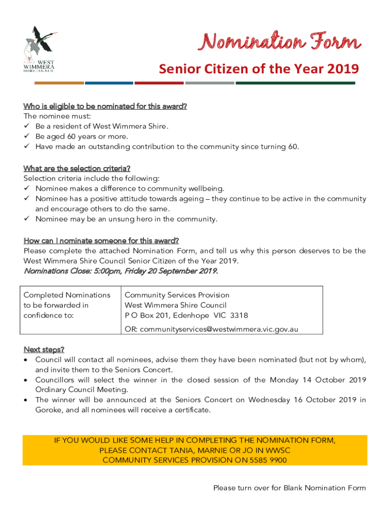 Nomination Form Senior Citizen of the Year 2019 Who is eligible to be nominated for this award? The nominee must: Be a resident of West Swimmer Shire. Be aged 60 years or more. Have made an outstanding