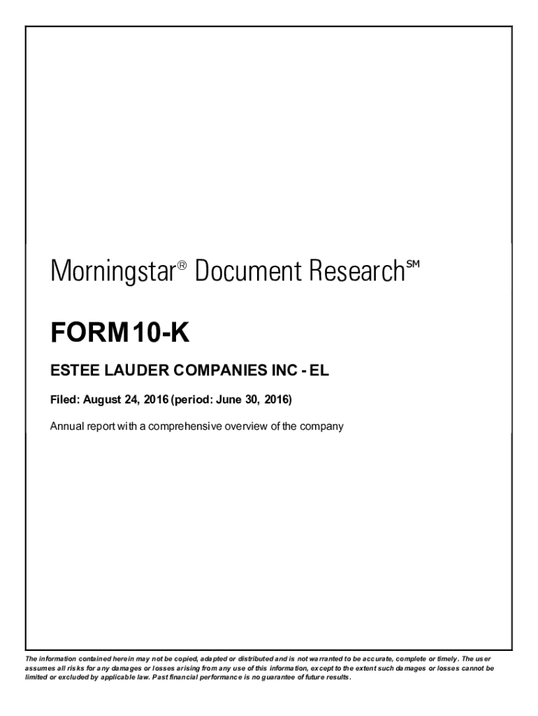 Morningstar Document Research FORM 10K ESTEEM LAUDER COMPANIES INC EL Filed: August 24, 2016 (period: June 30, 2016) Annual report with a comprehensive overview of the company information contained