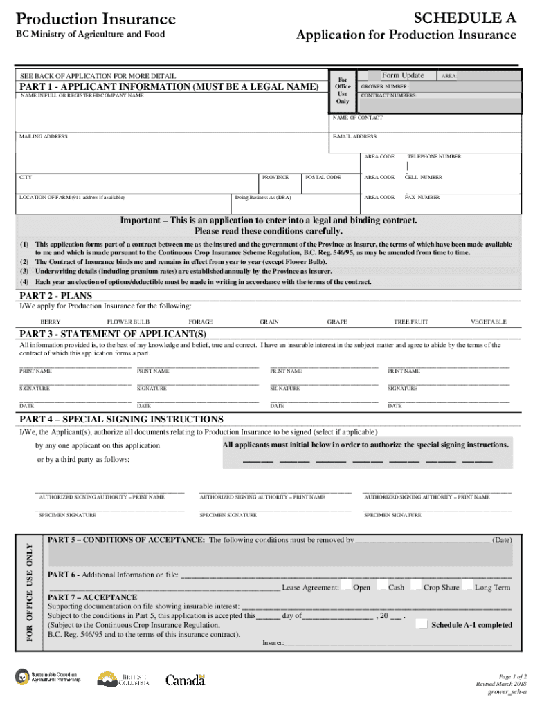 Production InsuranceSCHEDULE Application for Production Insurance BC Ministry of Agriculture and Food SEE BACK OF APPLICATION FOR MORE DETAILER 1 APPLICANT INFORMATION (MUST BE A LEGAL NAME) NAME