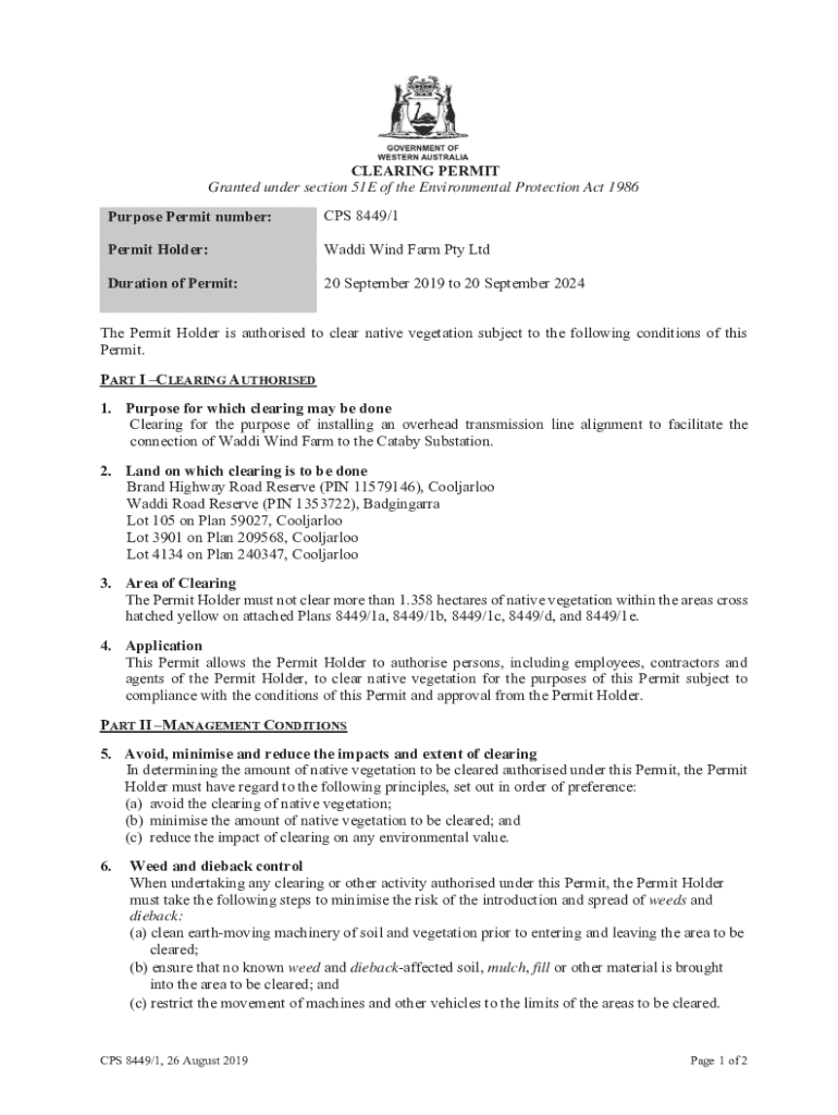 CLEARING PERMIT Granted under section 51E of the Environmental Protection Act 1986 Purpose Permit number:CPS 8449/1Permit Holder:Wadi Wind Farm Pty Duration of Permit:20 September 2019 to 20 September
