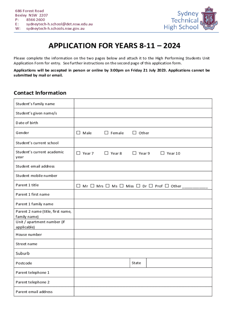 686 Forest Road Bella NSW 2207 P: 8566 2600 E: sydneytechh.school@det.nsw.edu.au W: sydneytechh.schools.NSW.gov.application FOR YEARS 811 2024 Please complete the information on the two pages below