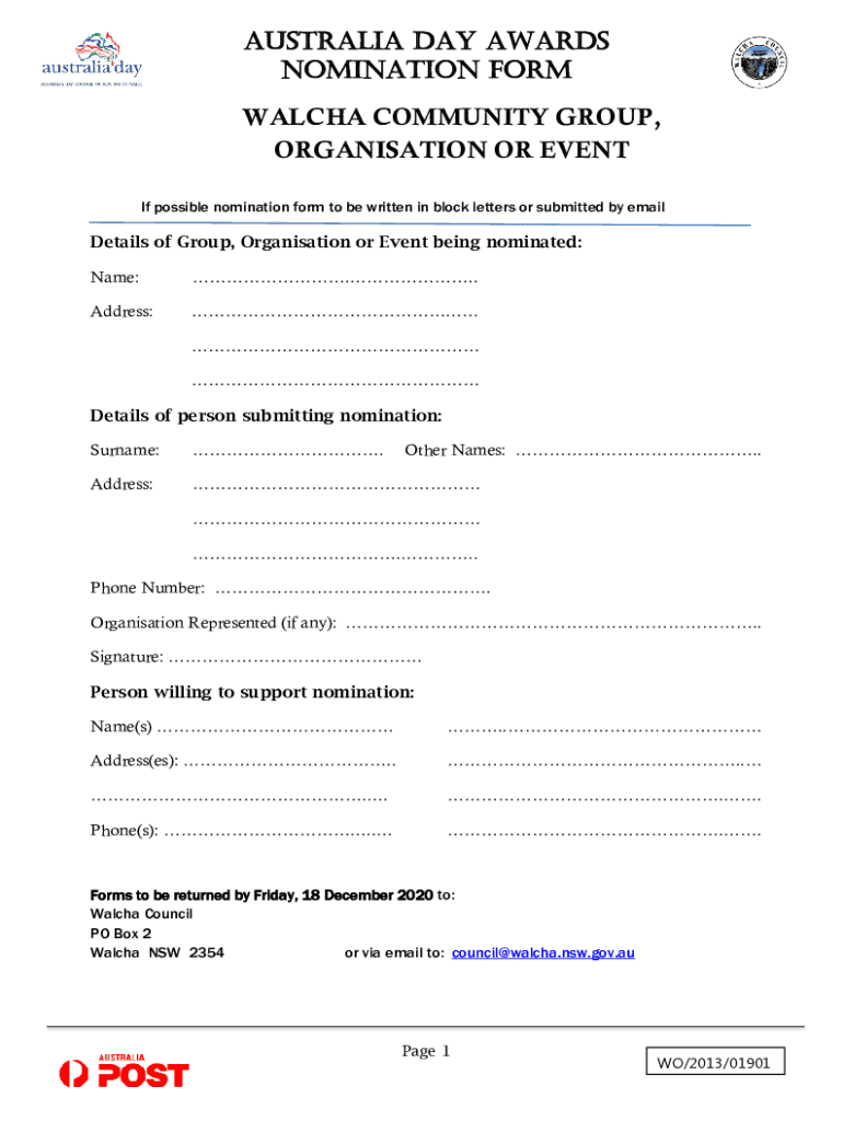 Get the free Australia Day Awards Nomination Form for Walcha Community Group, Organisation or Event