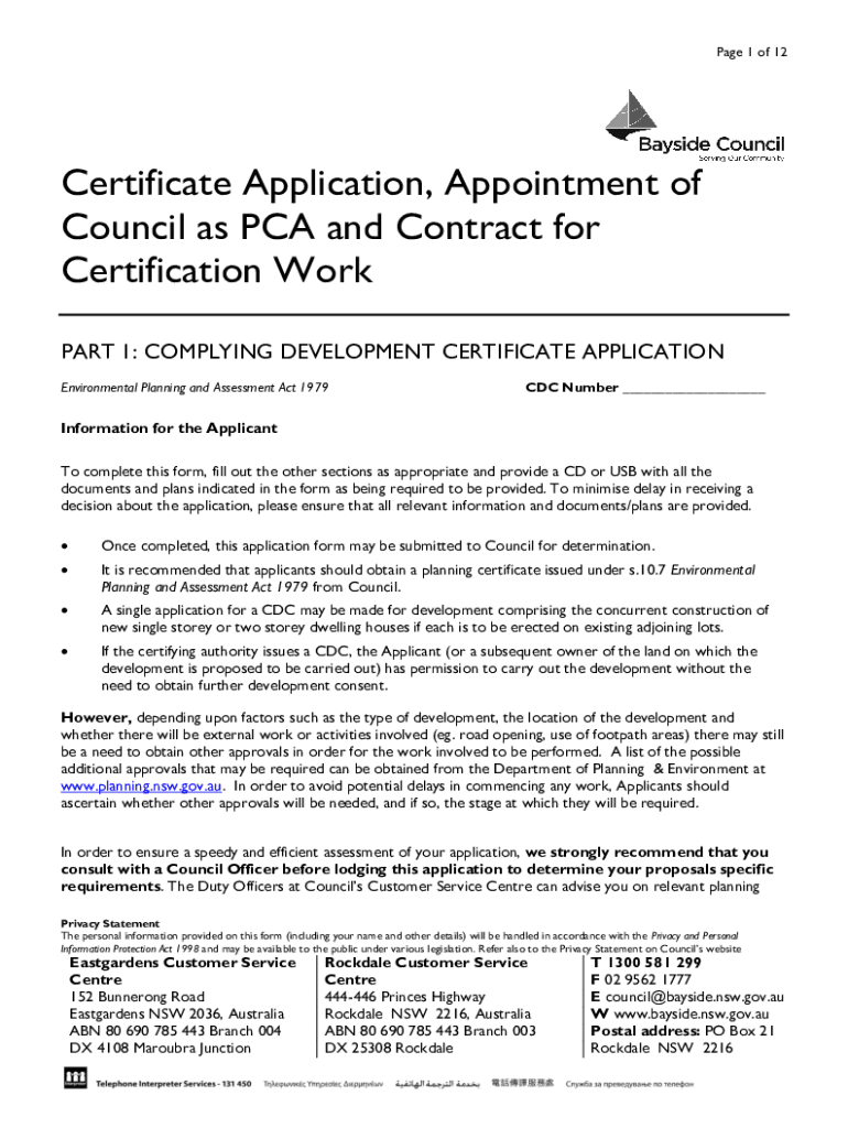 Page 1 of 12Certificate Application, Appointment of Council as PCA and Contract for Certification Work PART 1: COMPLYING DEVELOPMENT CERTIFICATE APPLICATION Environmental Planning and Assessment Act