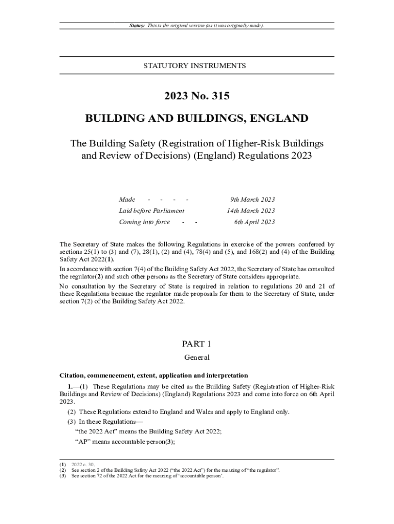 Status: This is the original version (as it was originally made).STATUTORY INSTRUMENTS2023 No. 315 BUILDING AND BUILDINGS, ENGLAND The Building Safety (Registration of Highers Buildings and Review