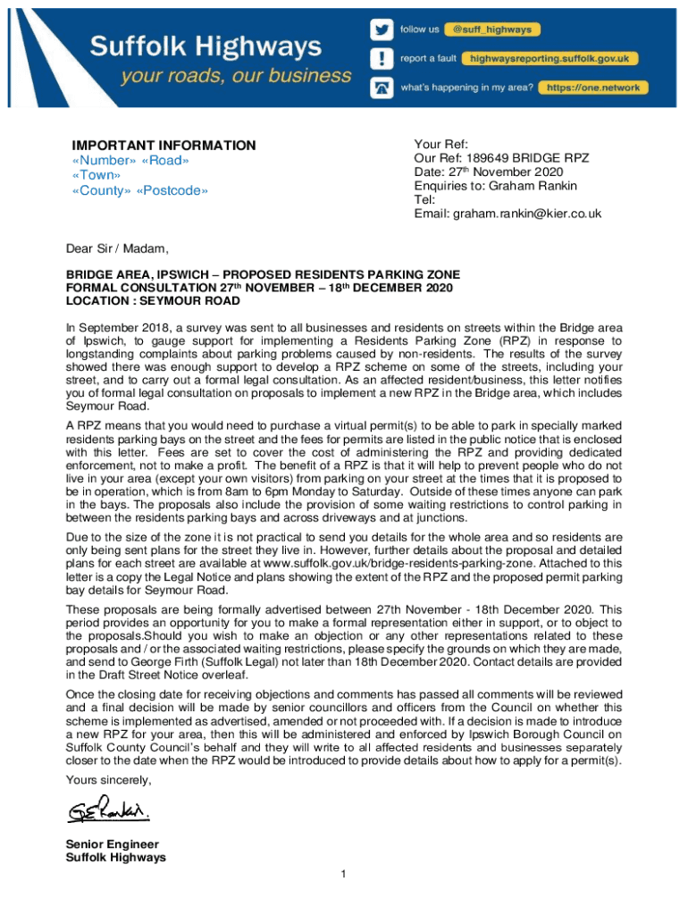 Your Ref: Our Ref: 189649 BRIDGE RPM Date: 27th November 2020 Inquiries to: Graham Rankin Tel: Email: graham.rankin@kier.co.ukIMPORTANT INFORMATION Number Road Town County PostcodeDear Sir / Madam,