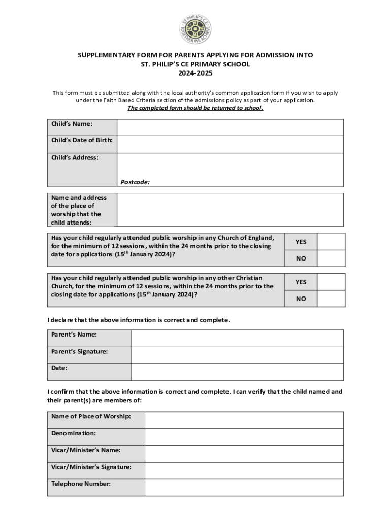 SUPPLEMENTARY FORM FOR PARENTS APPLYING FOR ADMISSION INTO ST. PHILIPS CE PRIMARY SCHOOL 20242025 This form must be submitted along with the local authorities common application form if you wish to