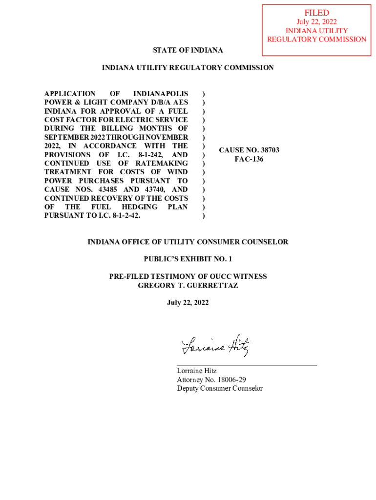 FILED July 22, 2022 INDIANA UTILITY REGULATORY COMMISSION STATE OF INDIANA UTILITY REGULATORY COMMISSION APPLICATION OF INDIANAPOLIS POWER & LIGHT COMPANY D/B/A AES INDIANA FOR APPROVAL OF A FUEL