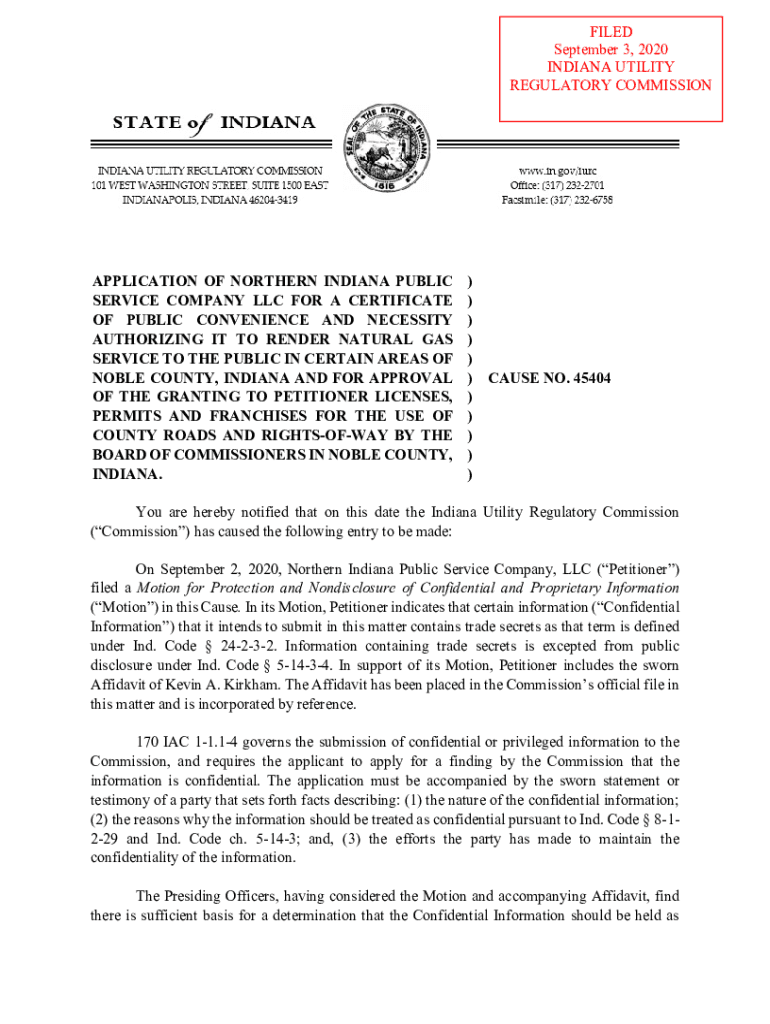 FILED September 3, 2020, INDIANA UTILITY REGULATORY COMMISSIONAPPLICATION OF NORTHERN INDIANA PUBLIC SERVICE COMPANY LLC FOR A CERTIFICATE OF PUBLIC CONVENIENCE AND NECESSITY AUTHORIZING IT TO RENDER