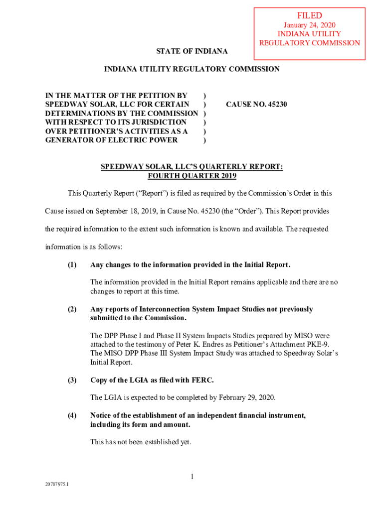 FILEDSTATE OF INDIANAJanuary 24, 2020 INDIANA UTILITY REGULATORY COMMISSIONINDIANA UTILITY REGULATORY COMMISSION IN THE MATTER OF THE PETITION BY SPEEDWAY SOLAR, LLC FOR CERTAIN DETERMINATIONS BY