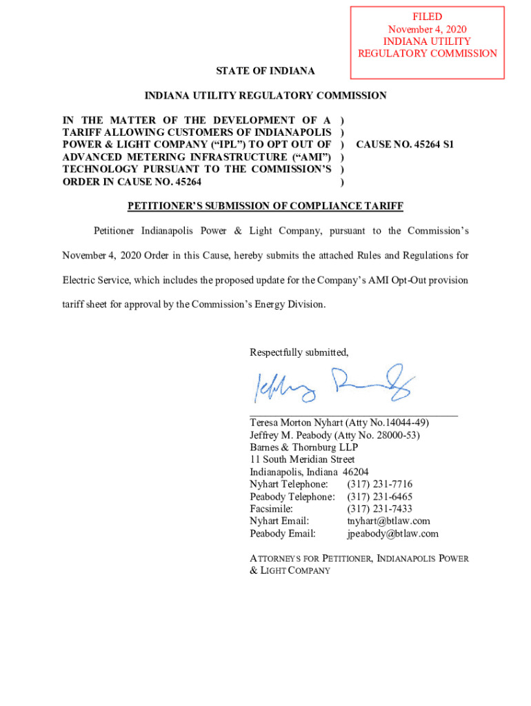 FILED November 4, 2020, INDIANA UTILITY REGULATORY COMMISSIONSTATE OF INDIANA UTILITY REGULATORY COMMISSION IN THE MATTER OF THE DEVELOPMENT OF A TARIFF ALLOWING CUSTOMERS OF INDIANAPOLIS POWER &
