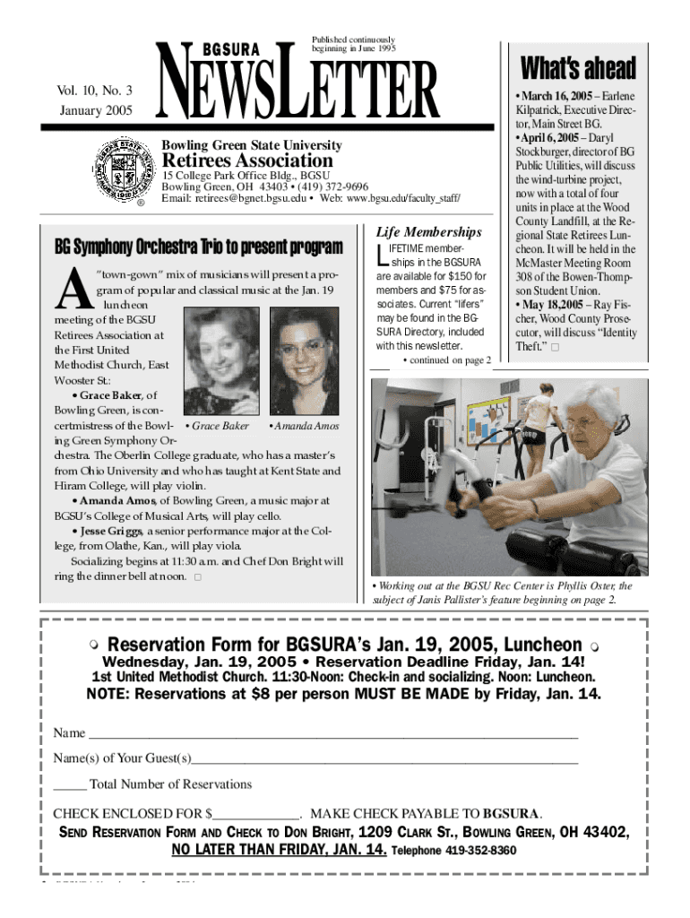 Published continuously beginning in June 1995NEWSLETTER B G S U Ravel. 10, No. 3 January 2005Bowling Green State UniversityRetirees Association 15 College Park Office Bldg., BGS Bowling Green, OH