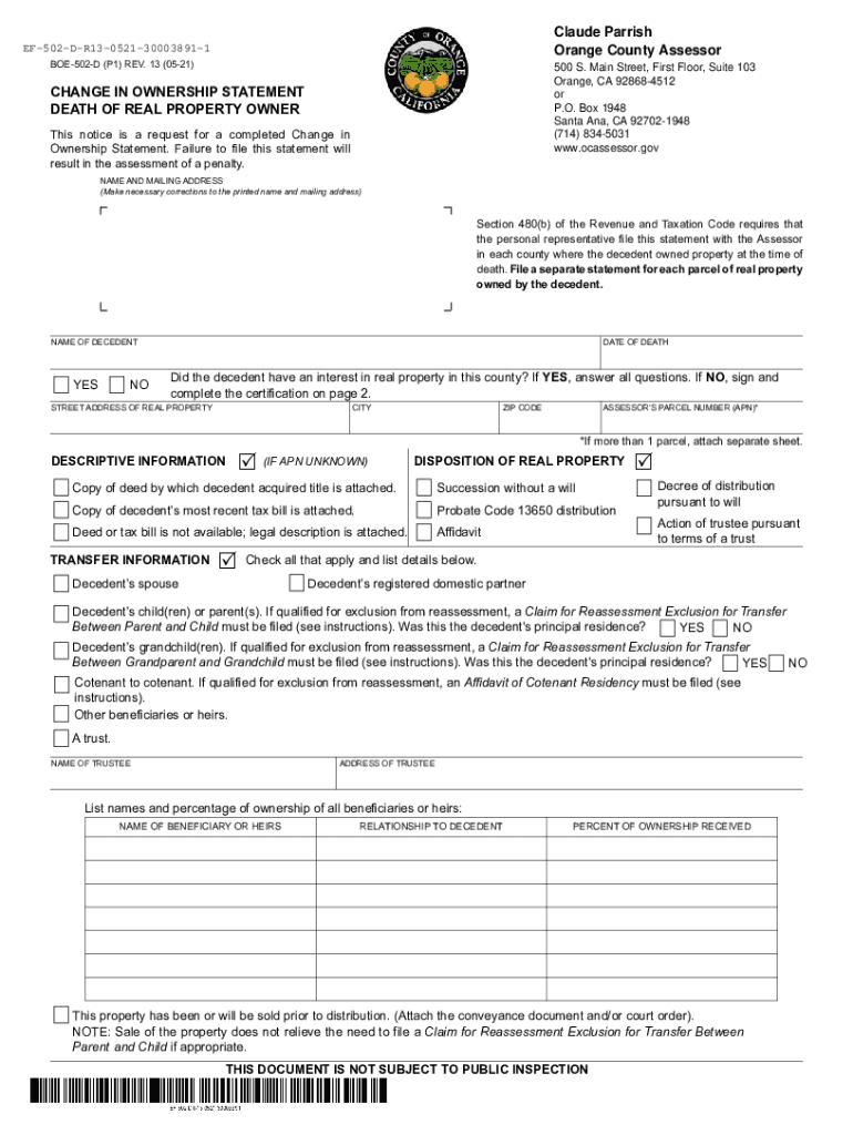 Claude Parrish Orange County AssessorEF502DR130521300038911 BOE502D (P1) REV. 13 (0521)500 S. Main Street, First Floor, Suite 103 Orange, CA 928684512 or P.O. Box 1948 Santa Ana, CA 927021948 (714)