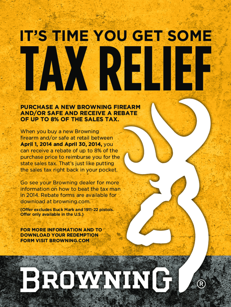 It's TIME YOU GET SOMEDAY RELIEF PURCHASE A NEW BROWNING FIREARM AND/OR SAFE AND RECEIVE A REBATE OF UP TO 8% OF THE SALES TAX. When you buy a new Browning firearm and/or safe at retail between April