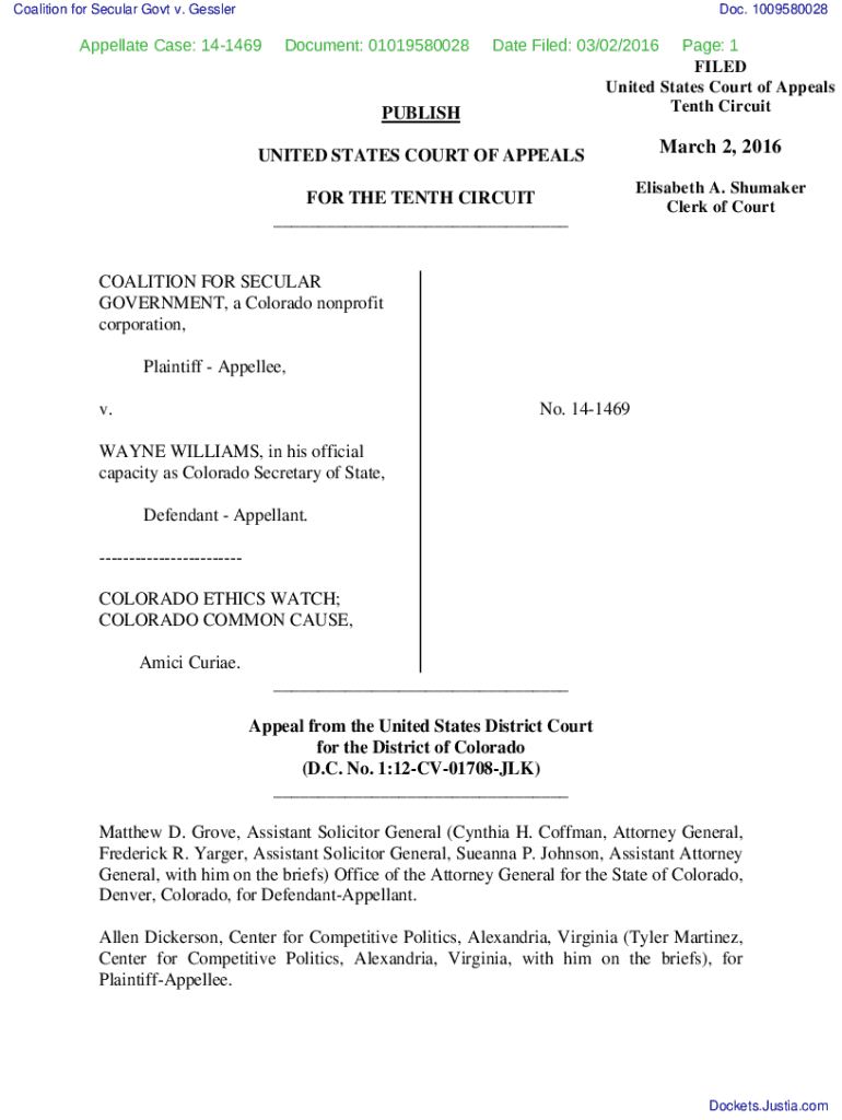 Coalition for Secular Govt v. GesslerDoc. 1009580028Appellate Case: 141469Document: 01019580028Date Filed: 03/02/2016PUBLISHPage: 1