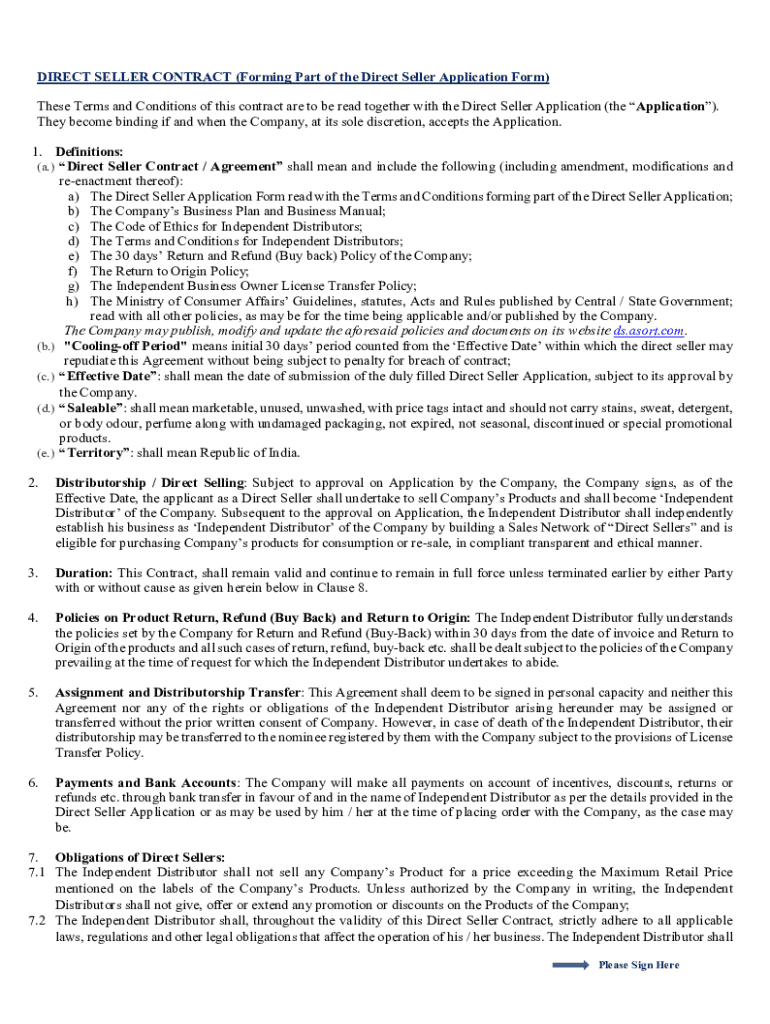 DIRECT SELLER CONTRACT (Forming Part of the Direct Seller Application Form) These Terms and Conditions of this contract are to be read together with the Direct Seller Application (the Application).
