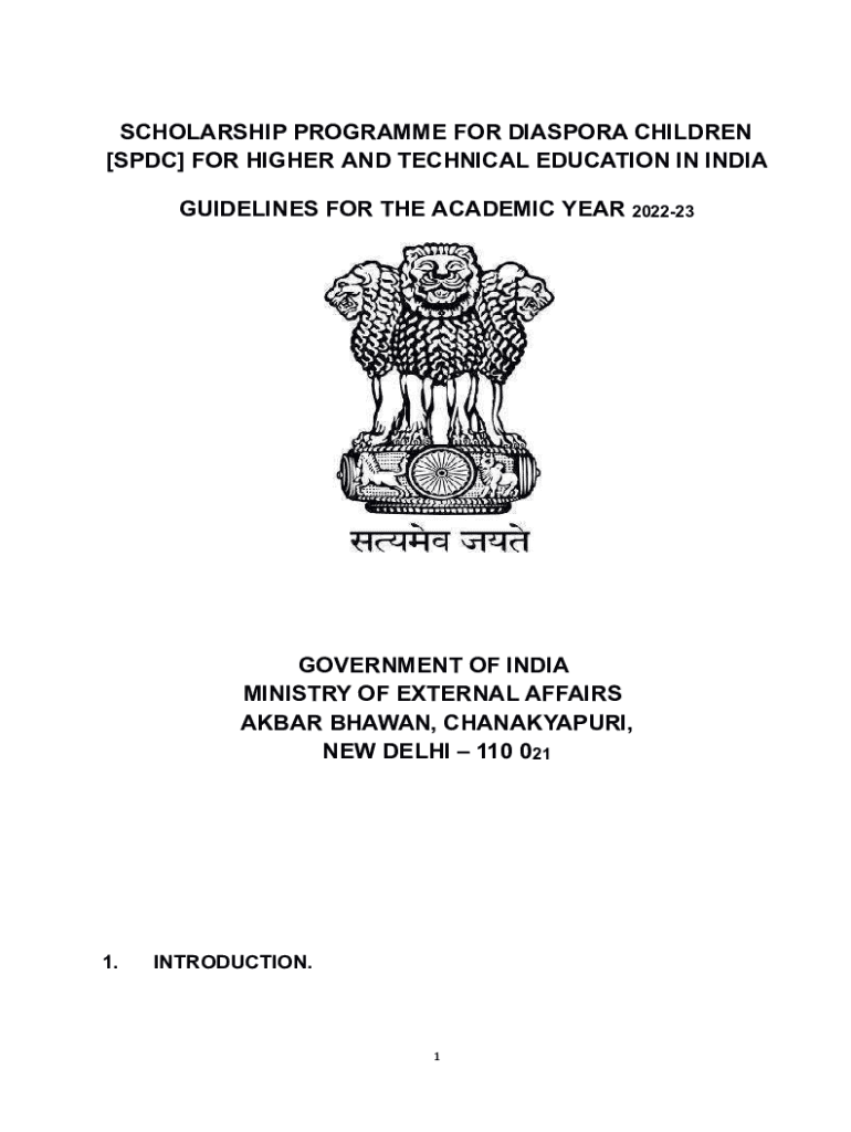 SCHOLARSHIP Program FOR DIASPORA CHILDREN [SPEC] FOR HIGHER AND TECHNICAL EDUCATION IN INDIA GUIDELINES FOR THE ACADEMIC YEAR 202223GOVERNMENT OF INDIA MINISTRY OF EXTERNAL AFFAIRS AKBAR SHAWN, CHANAKYAPURI,