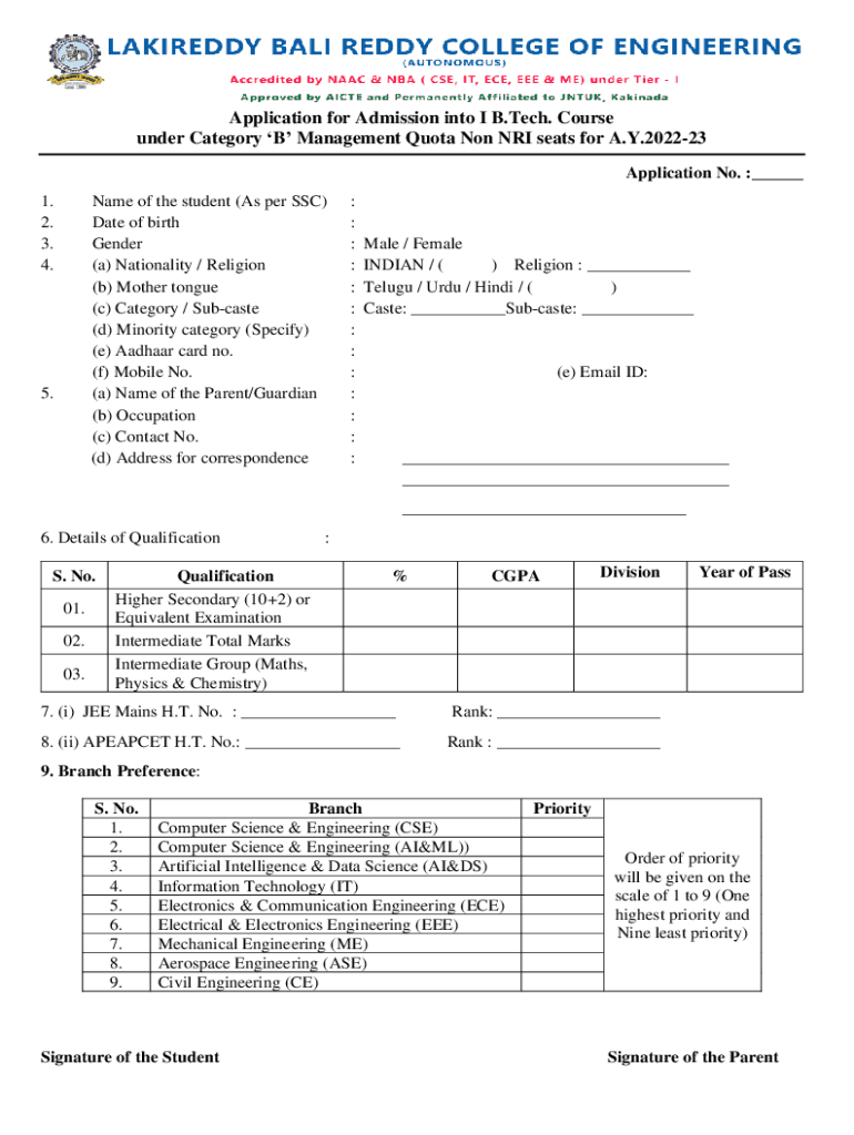 Application for Admission into I B. Tech. Course under Category B Management Quota Non NRI seats for A.Y.202223 Application No. ___ 1. 2. 3. 4. Name of the student (As per SSC) Date of birth Gender