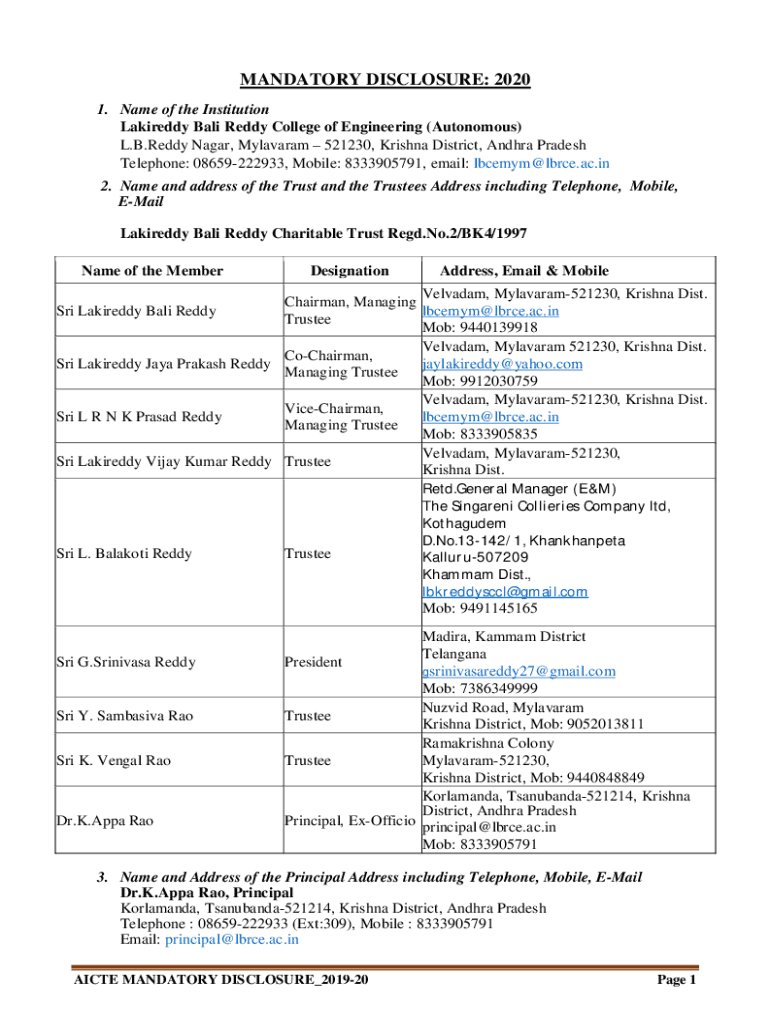 MANDATORY DISCLOSURE: 2020 1. Name of the Institution Lakireddy Bali Reddy College of Engineering (Autonomous) L.B. Reddy Nagar, Malayalam 521230, Krishna District, Andhra Pradesh Telephone: 08659222933,