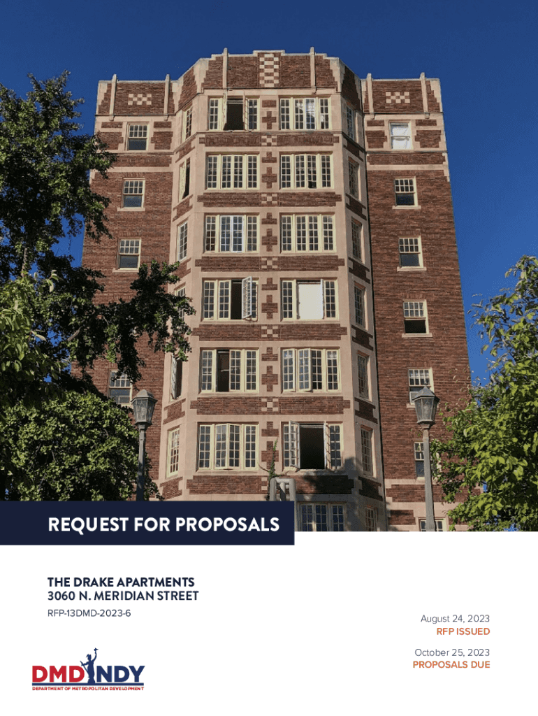 REQUEST FOR PROPOSALS THE DRAKE APARTMENTS 3060 N. MERIDIAN STREET RFP13DMD20236DMDDEPARTMENT OF METROPOLITAN DEVELOPMENT August 24, 2023 RFP ISSUED October 25, 2023, PROPOSALS DISCONTENTS 01. Introduction