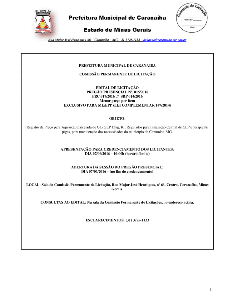 Prefecture Municipal de Caranaba Est ado de Minas Gerais RUA Major Jo's Henriques, 66 Canada MG 313725.1133 licitacao@caranaiba.mg.gov.brPREFEITURA MUNICIPAL DE PARANOIA COMICS PERMANENT DE LICITAOEDITAL