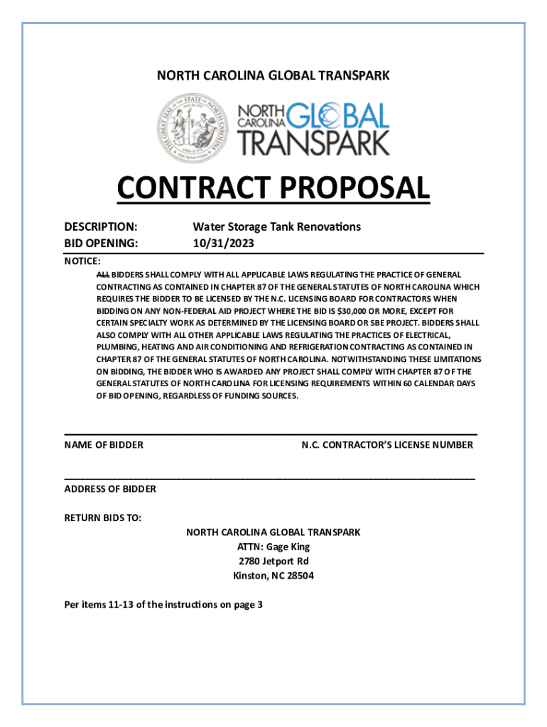 NORTH CAROLINA GLOBAL TRANSPARKCONTRACT PROPOSAL DESCRIPTION: BID OPENING:Water Storage Tank Renovations 10/31/2023NOTICE: ALL BIDDERS SHALL COMPLY WITH ALL APPLICABLE LAWS REGULATING THE PRACTICE