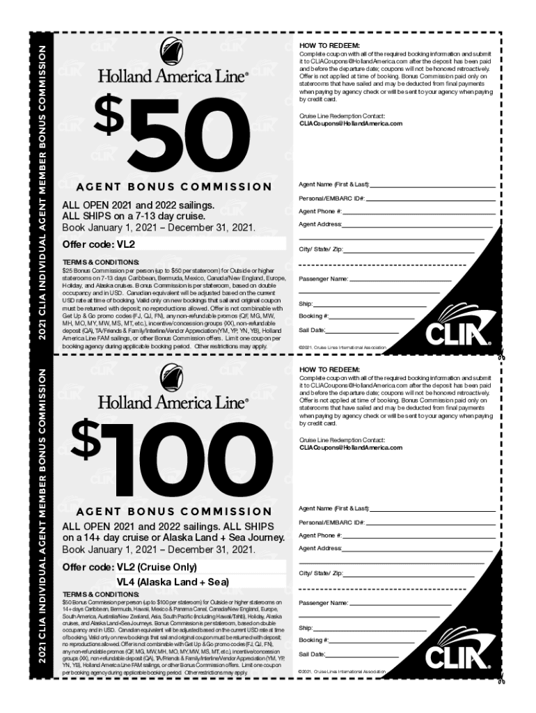 2021 CIA INDIVIDUAL AGENT MEMBER BONUS COMMISSION 2021 CIA INDIVIDUAL AGENT MEMBER BONUS COMMISSION TO REDEEM:$50AGENT BONUS COMMISSION ALL OPEN 2021 and 2022 sailings. ALL SHIPS on a 713-day cruise.