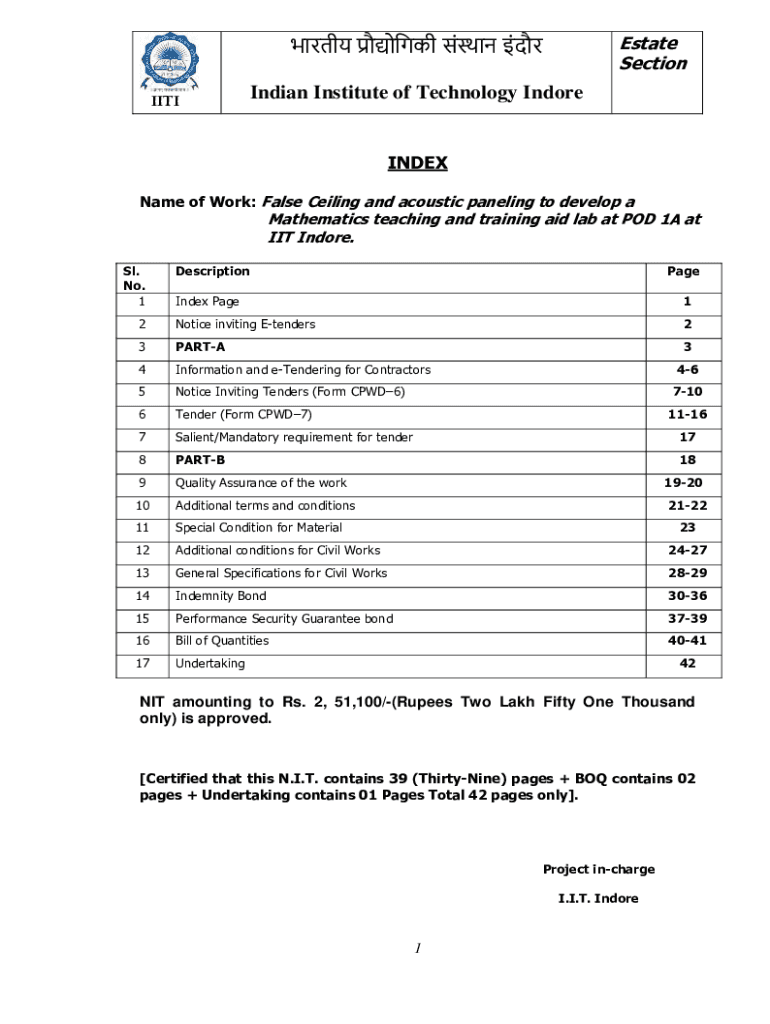Estate Section IITIIndian Institute of Technology IndoreINDEX Name of Work: False Ceiling and acoustic paneling to develop mathematics teaching and training aid lab at POD 1A at IIT Indore. SL. No.