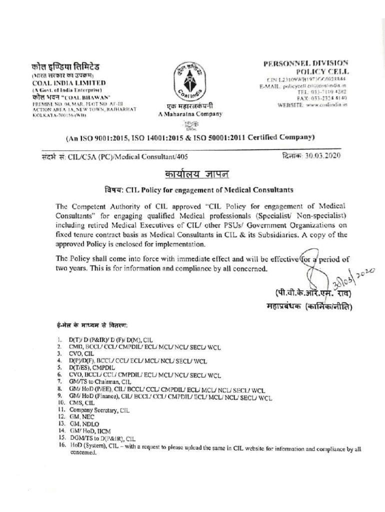 CIL Policy for engagement of Medical Consultants 1. Title and commencement This policy is called as CIL Policy for engagement of Medical Consultants. It will come into force with immediate effect.2.