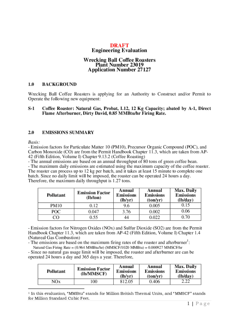 DRAFT Engineering Evaluation Wrecking Ball Coffee Roasters Plant Number 23019 Application Number 27127 1.0BACKGROUNDWrecking Ball Coffee Roasters is applying for an Authority to Construct and/or Permit