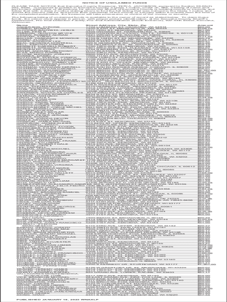 NOTICE OF UNCLAIMED FUNDS PLEASE TAKE NOTICE that Kenosha County Treasurer, TERI A. JACOBSON, pursuant to Section 59.66(2) Wis. Stats. Is required to publish in Kenosha County a Class 1 notice, under
