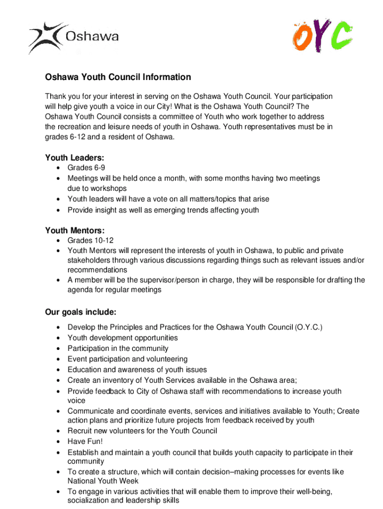 Oshawa Youth Council Information Thank you for your interest in serving on the Oshawa Youth Council. Your participation will help give youth a voice in our City! What is the Oshawa Youth Council?