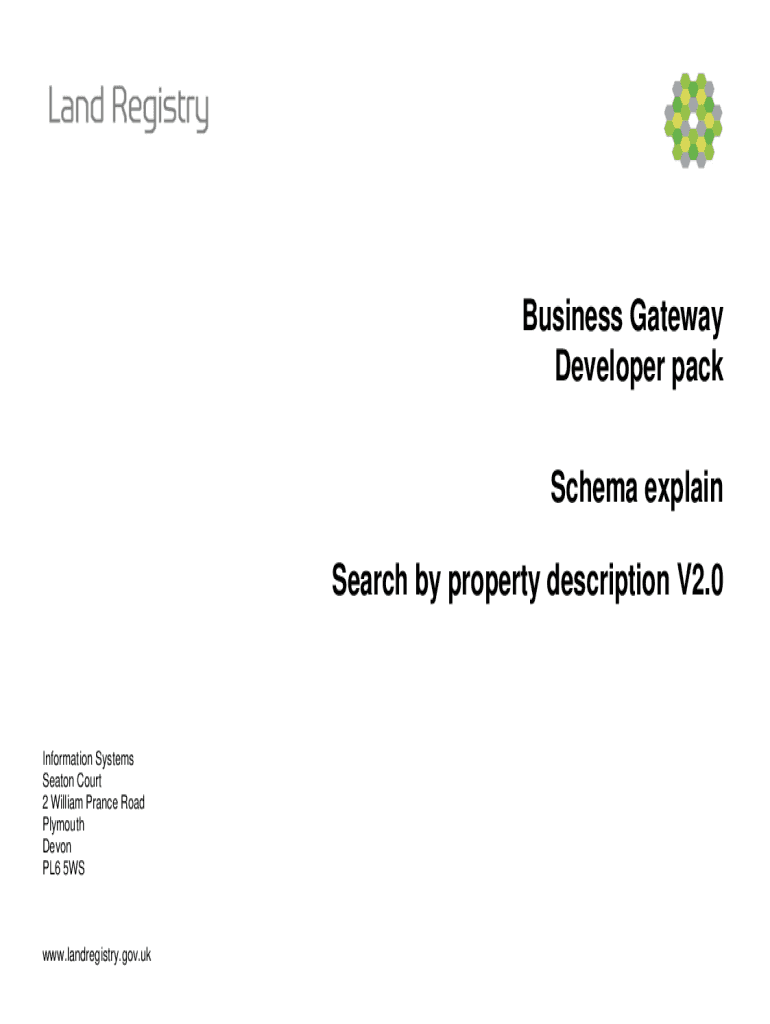 Business Gateway Developer pack Schema explain Search by property description V2.0Information Systems Season Court 2 William Prance Road Plymouth Devon PL6 5WSwww.land registry.gov.data Input Field
