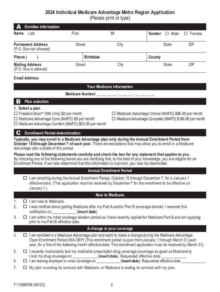 OMB No. 09381378 Expires: 7/31/20242024 Blue Cross Medicare Advantage (PPO) Metro Region ApplicationApplication Instructions Please read before completing. Reminders: Who can use this form? If you
