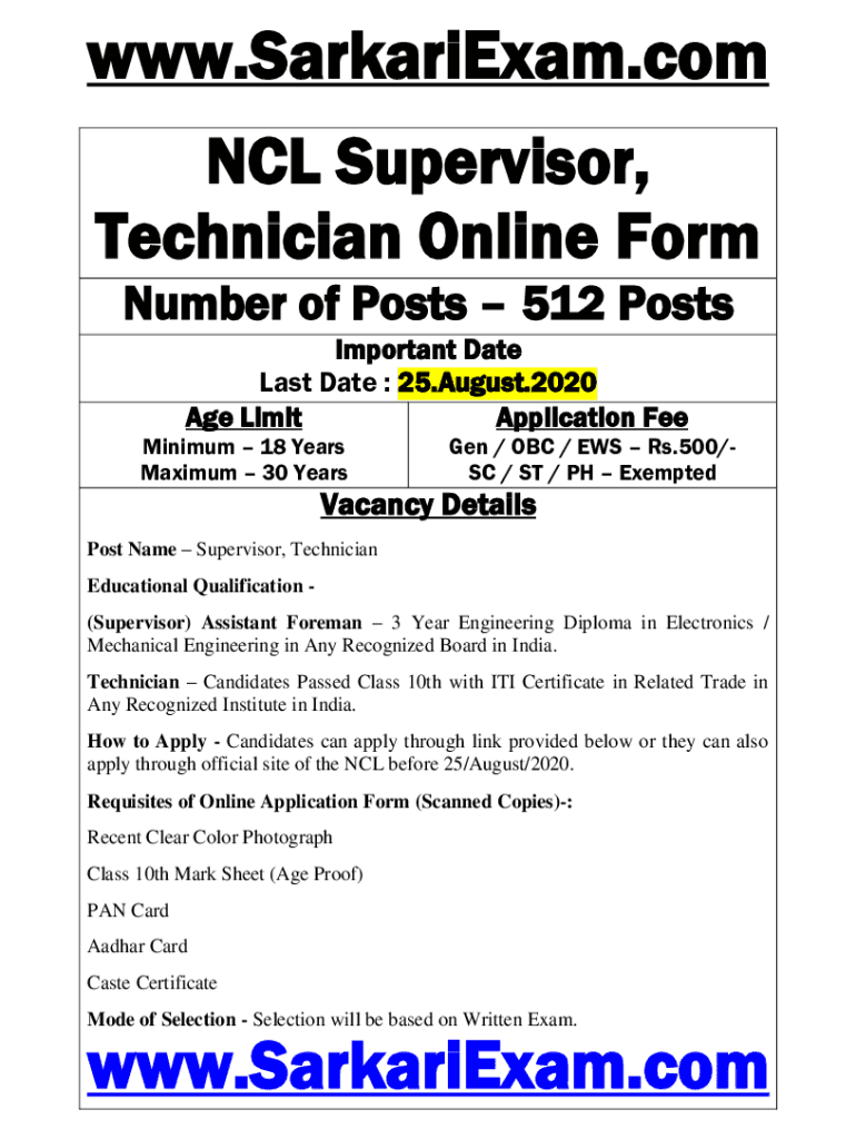 WWW.SarkariExam.com NCL Supervisor, Technician Online Form Number of Posts 512 Posts Important Date Last Date : 25. August.2020 Age Limit Application Fee Minimum 18 Years Maximum 30 Years Gen / OBC