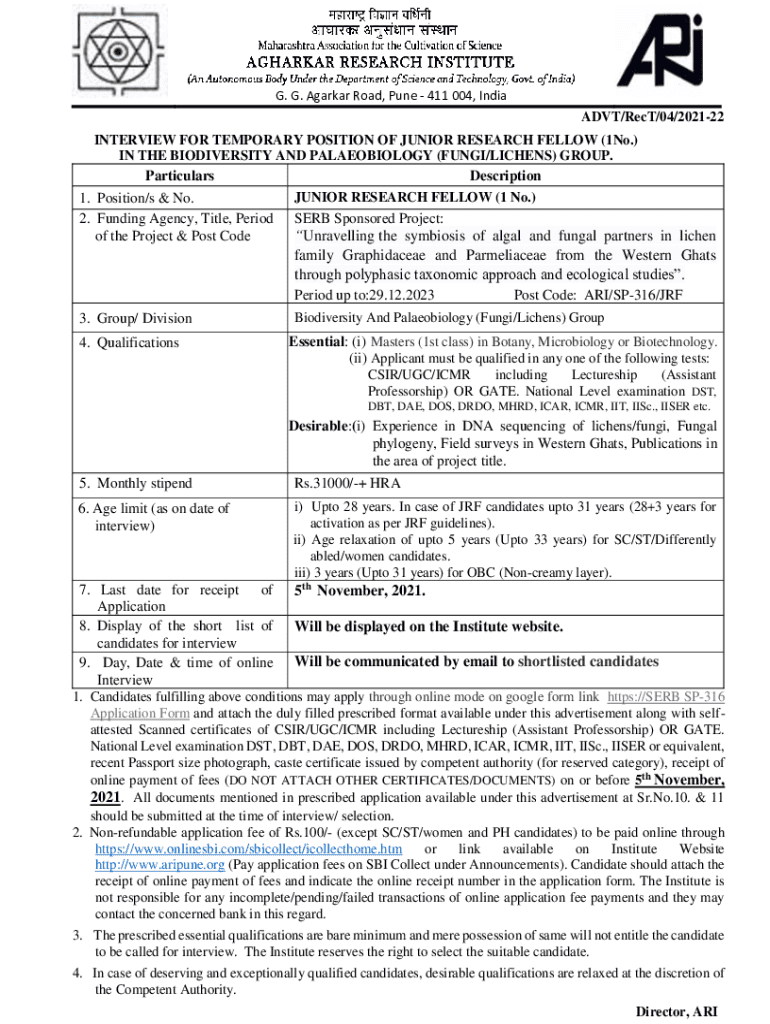 G. G. Agarwal Road, Pune 411 004, India ADVT/Rest/04/202122 INTERVIEW FOR TEMPORARY POSITION OF JUNIOR RESEARCH FELLOW (1No.) IN THE BIODIVERSITY AND PALEONTOLOGY (FUNGI/LICHENS) GROUP. Particulars