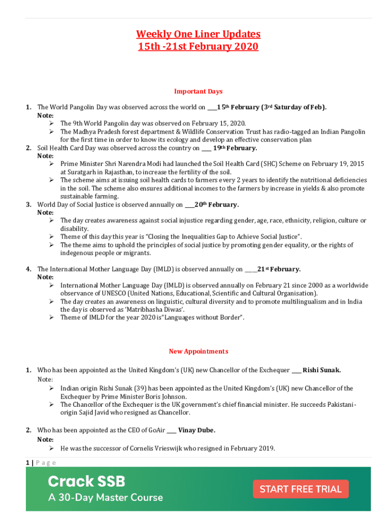 Weekly One Liner Updates 15th 21st February 2020Important Days 1. The World Pangolin Day was observed across the world on ___15th February (3rd Saturday of Feb). Note: The 9th World Pangolin day was