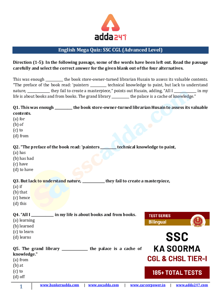English Mega Quiz: SSC CGL (Advanced Level) Direction (15): In the following passage, some words have been left out. Read the passage carefully and select the correct answer for the given blank out