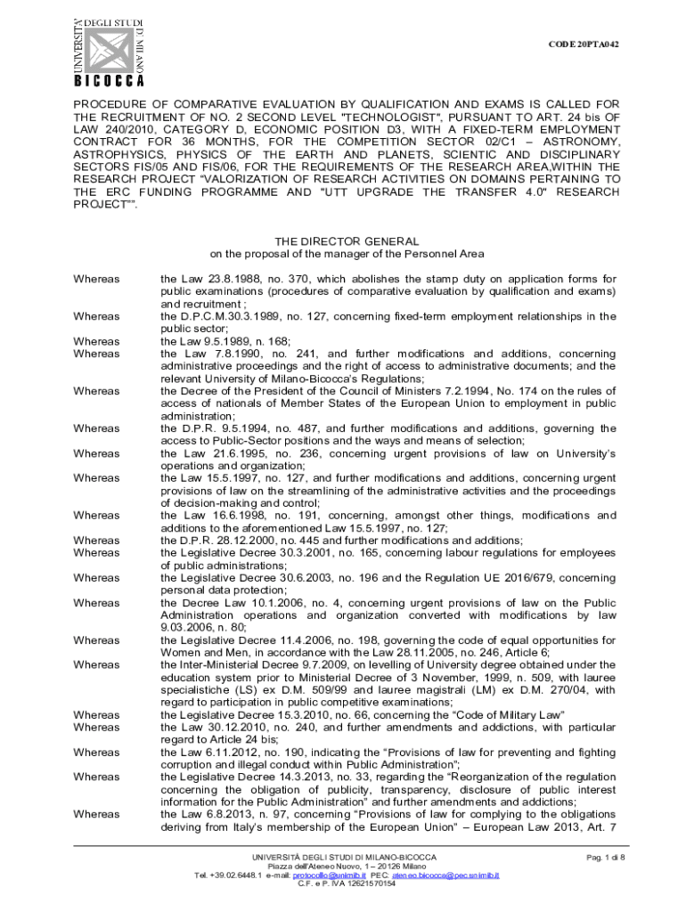 CODE 20PTA042PROCEDURE OF COMPARATIVE EVALUATION BY QUALIFICATION AND EXAMS IS CALLED FOR THE RECRUITMENT OF NO. 2-SECOND LEVEL \” TECHNOLOGIST\”, PURSUANT TO ART. 24 bis OF LAW 240/2010, CATEGORY