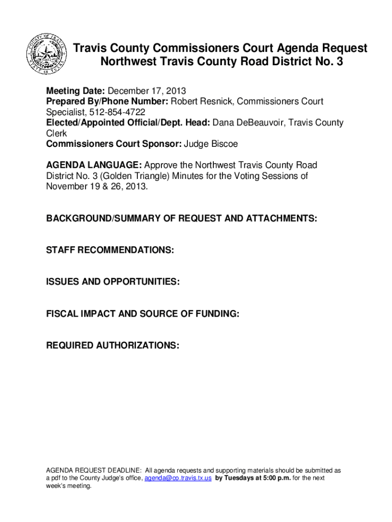 Travis County Commissioners Court Agenda Request Northwest Travis County Road District No. 3 Meeting Date: December 17, 2013, Prepared By/Phone Number: Robert Re snick, Commissioners Court Specialist,