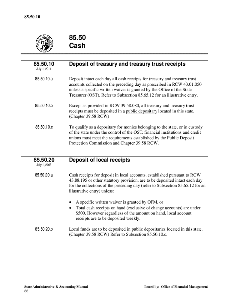 85.50.1085.50 Cash 85.50.10 July 1, 2011Deposit of treasury and treasury trust receipts85.50.10.deposit intact each day all cash receipts for treasury and treasury trust accounts collected on the