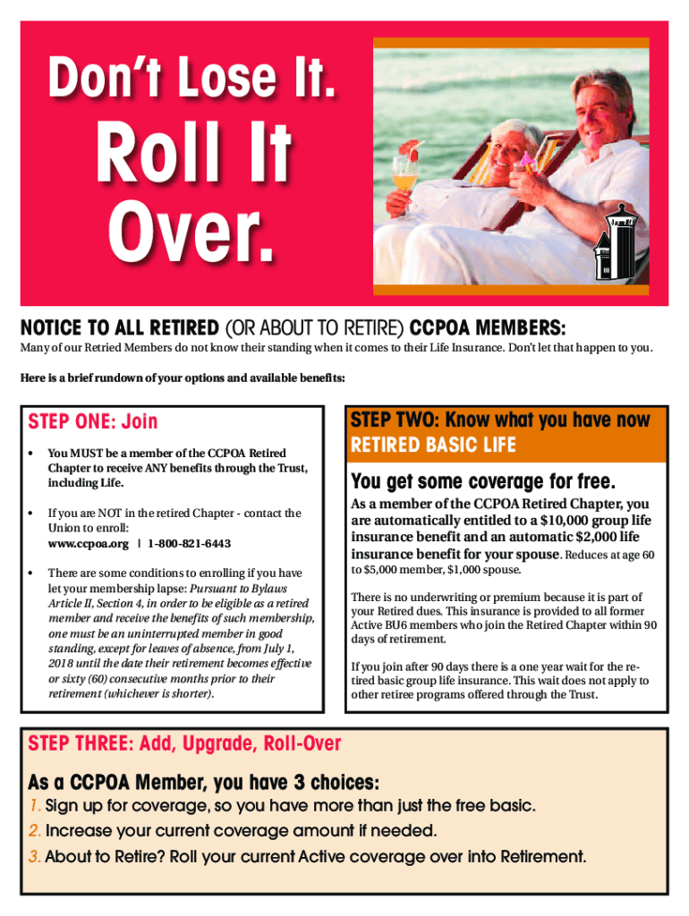 Don't Lose It. Roll It Over. NOTICE TO ALL RETIRED (OR ABOUT TO RETIRE) CC POA MEMBERS: Many of our Retried Members do not know their standing when it comes to their Life Insurance. Don't let that