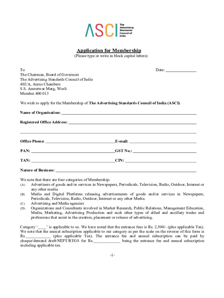 Application for Membership (Please type or write in block capital letters)To The Chairman, Board of Governors The Advertising Standards Council of India 402/A, Taurus Chambers S.S. Amritsar Mary,