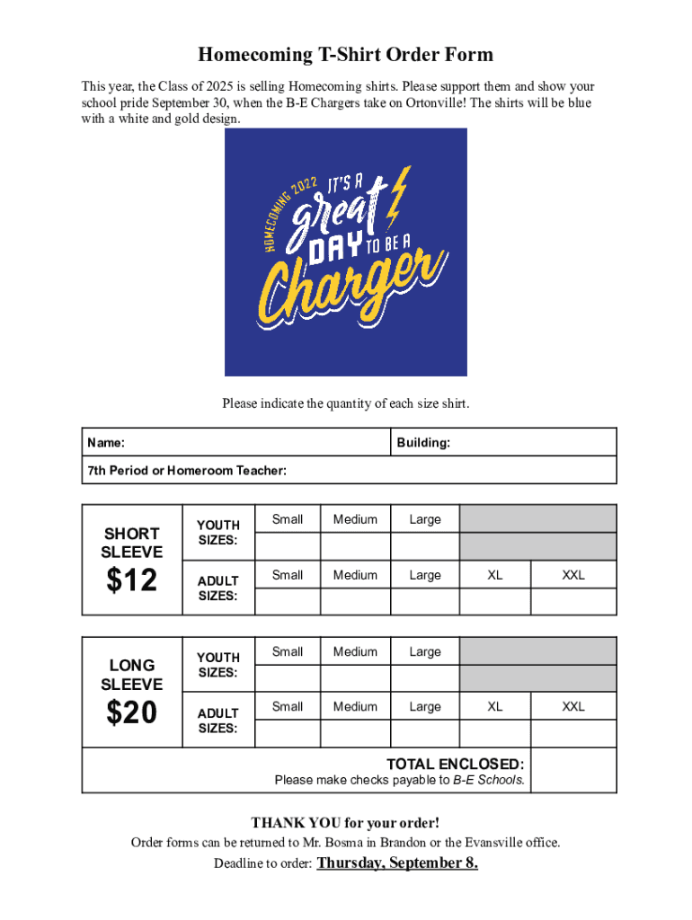 Homecoming Shirt Order Form This year, the Class of 2025 is selling Homecoming shirts. Please support them and show your school pride September 30, when the BE Chargers take on Eatonville! The shirts