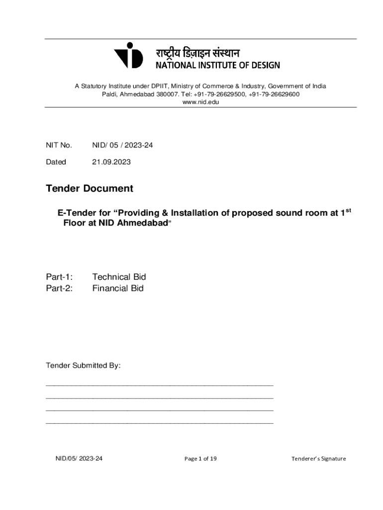 A Statutory Institute under DP IIT, Ministry of Commerce & Industry, Government of India Aldi, Ahmedabad 380007. Tel: +917926629500, +917926629600 www.nid.eduNIT No.NID/ 05 / 202324Dated21.09.2023Tender