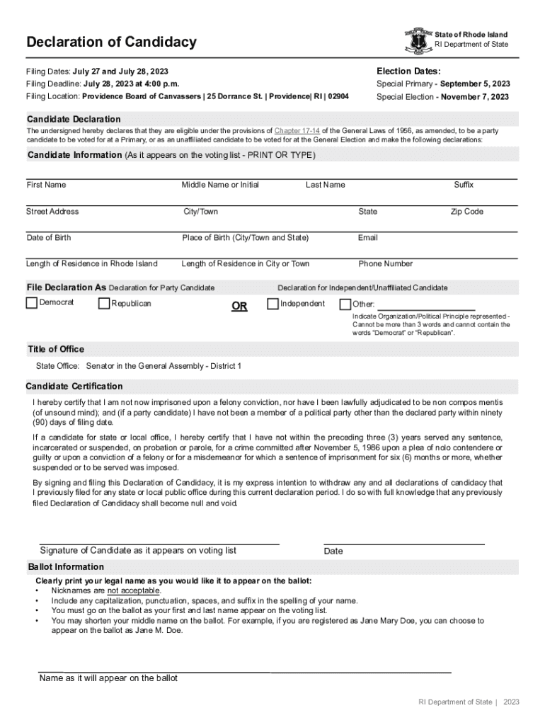 State of Rhode Island RI Department of StateDeclaration of Candidacy Filing Dates: July 27 and July 28, 2023Election Dates:Filing Deadline: July 28, 2023, at 4:00 p.m. Special Primary September 5,