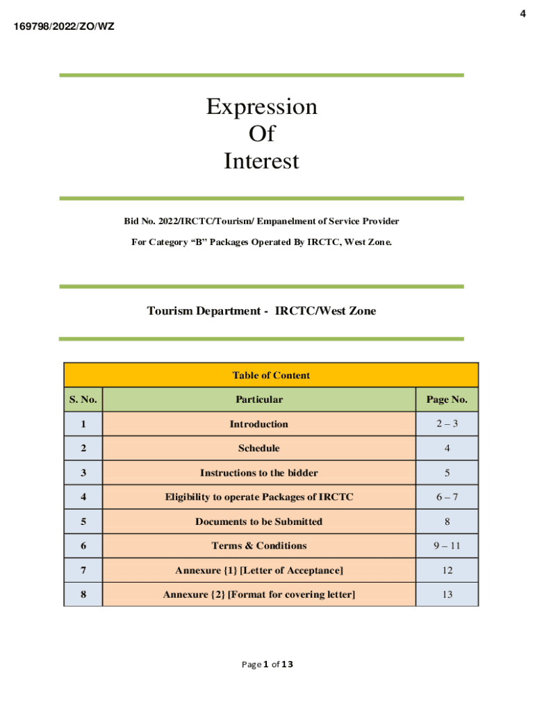 4 169798/2022/ZO/Expression Of Interest Bid No. 2022/IR CTC/Tourism/ Embankment of Service Provider For Category B Packages Operated By IR CTC, West Zone. Tourism Department IR CTC/West Constable